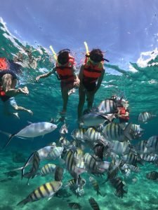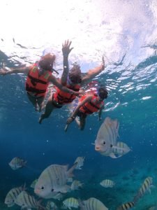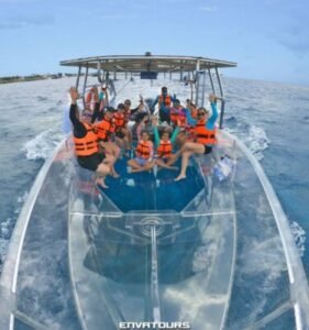 Pasaremos por el monumento al buzo y posteriormente conocerás las maravillosas sorpresas que la isla tiene de bajo del agua como los barcos hundidos, inmensa variedad de corales y peces tropicales, las cuales podrás disfrutar desde nuestra lancha totalmente transparente. Al final nos trasladamos hacia un arrecife bajo nombrado «Villa Blanca» en donde podrás disfrutar de la maravillosa vida marina.